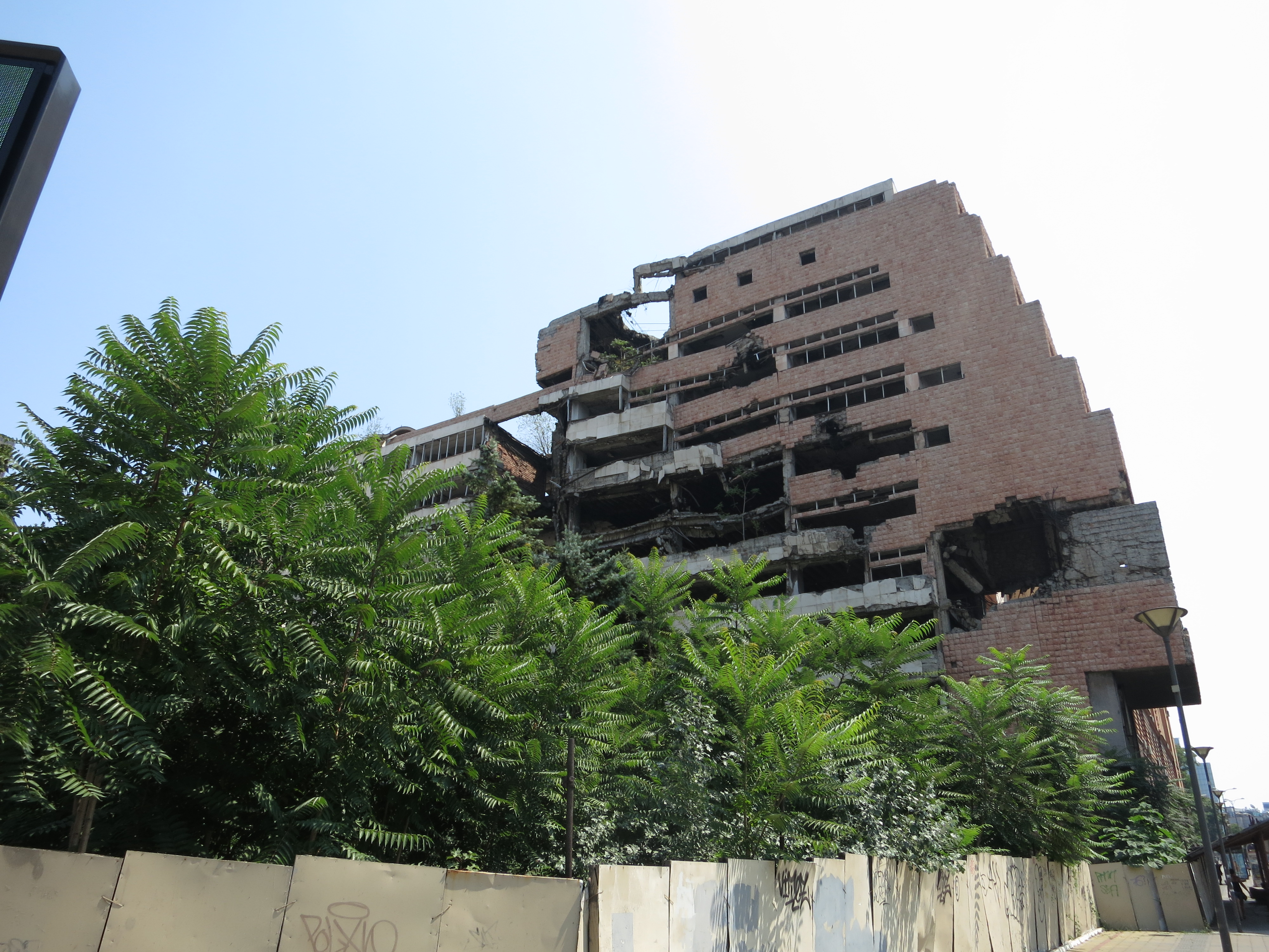The old Yugoslav Ministry of Defence, bombed by NATO in 1999, still standing in ruins in central Belgrade