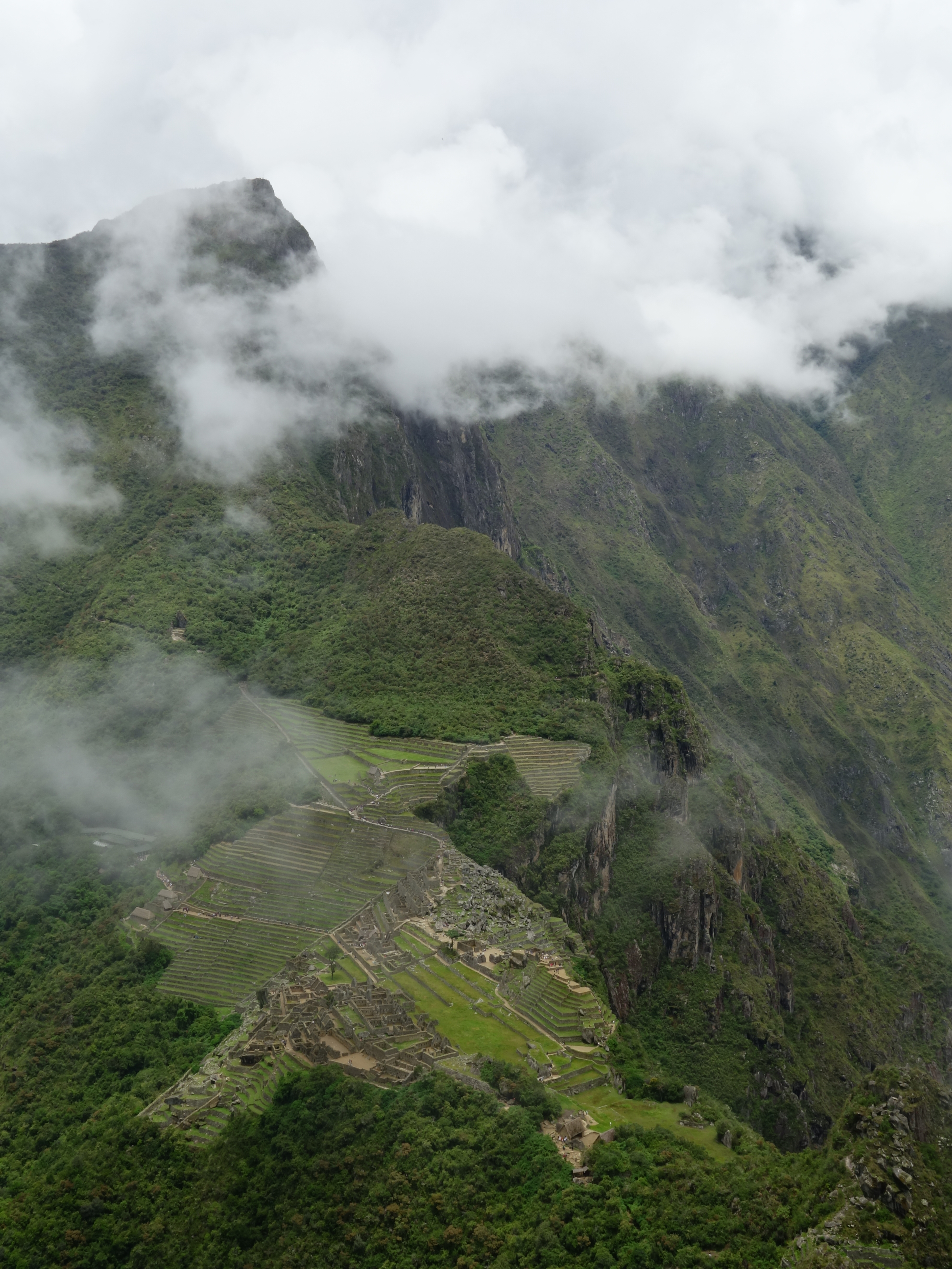 Once up the ladders, there’s a few other vaguely tricky bits, then there’s the bit where the sky opens up in a torrential downpour just as you reach the top. But even so, there’s a good view of Machu Picchu. Unless the downpour also includes clouds obscuring your view. Which mostly it did, on this particular occasion.